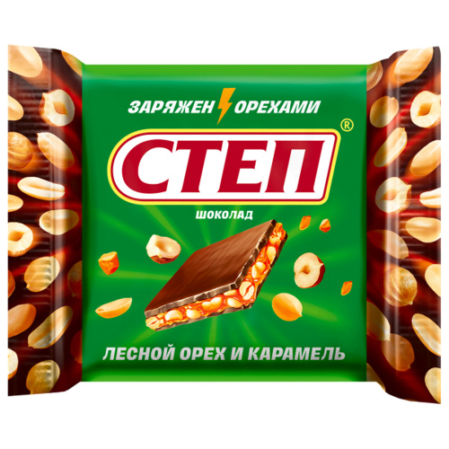Молочный шоколад оригинального формата с мягкой карамельной начинкой, фундуком и арахисом