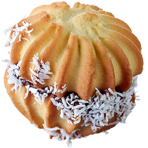 Два печенья соединены кремом лакомка в кокосовой стружке