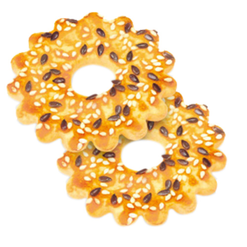 Рассыпчатое песочное печенье в виде кольца с посыпкой семенами льна и кунжута.