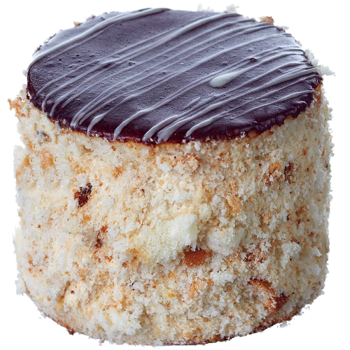 Пирожное украшено гладкой шоколадной глазурью и нежным кремом на верхней поверхности. Боковые стороны обсыпаны бисквитной крошкой. Внутри — несколько слоев воздушного бисквита, пропитанных кремом.