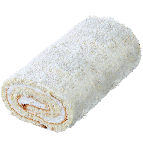 Рулет из нежного бисквитного теста, аккуратно свернутый в спираль, покрыт легким кремом и обсыпан кокосовой стружкой, а слои суфле гармонично дополняют вкус, создавая идеальную текстуру.