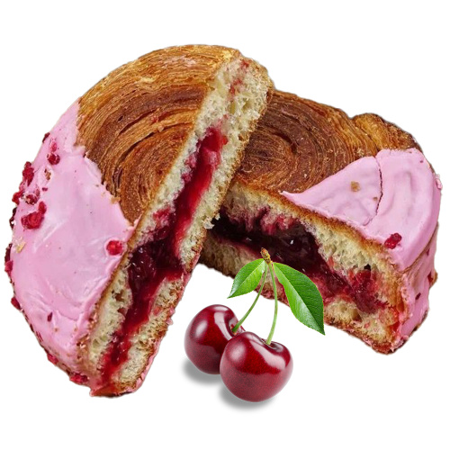 Слоеный круассан, обладающий хрустящей корочкой и мягкой, воздушной текстурой внутри. Наполнен вишневой начинкой. Украшен цветной глазурью и сублимированными ягодами.Идеально подходит для завтрака или перекуса, сочетая в себе вкус и аромат французской кухни.