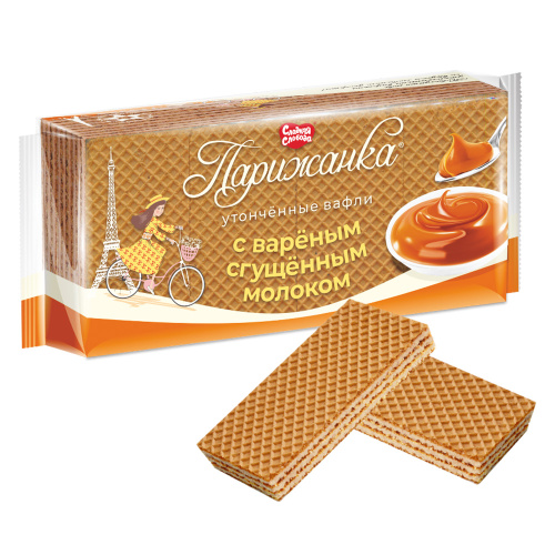 Утонченные вафли с добавлением вареного сгущенного молока. Хрустящий вафельный лист и нежная кремовая начинка.Разрешено для питания детей с 3-х лет.