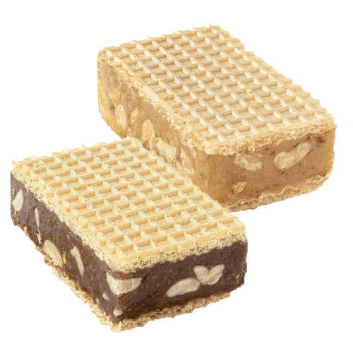 Две вафли соединенные между собой различными начинками: сгущенка с арахисом и изюм с орехами